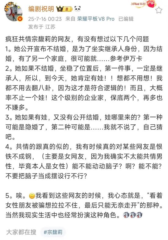 7月16日,编剧祝明还发微博对此事进行了评论,据他表示:宗馥莉公开宣布不结婚,是为了坐实继承人身份。还推测:“她肯定有娃。”